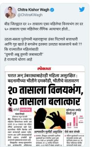 “बीड जिल्ह्यात दर २० तासाला एका महिलेचा विनयभंग तर दर ६० तासाला एका महिलेवर लैंगिक अत्याचार होतो. उठता-बसता पुरोगामी महाराष्ट्राचा डंका पिटणारे सत्ताधारी आणि गृह खाते हे सगळेच इतक्या उलट्या काळजाचे कसे ? कि राज्यातील महिलांसाठी “तुमची अब्रू तुमची जबाबदारी” हे राज्याचे धोरण आहे.”, असा सवाल चित्रा वाघ यांनी ट्वीट करत केला आहे.